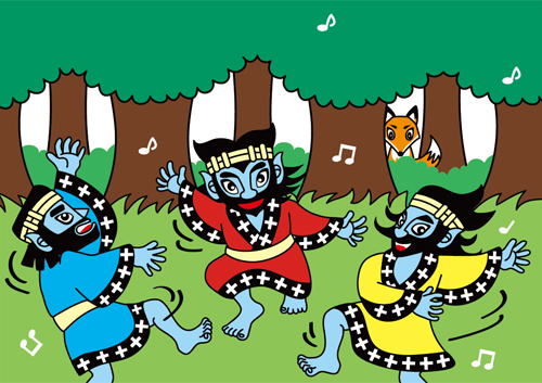 ウェンカムイ(わるいかみ)たちは ちょうしにのって うたいだし おどり はじめた。