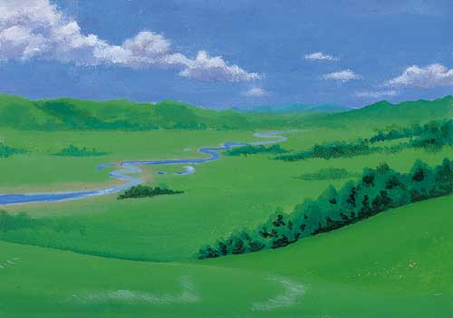 きんいろの おひさまに はらっぱも かわも かがやいている。