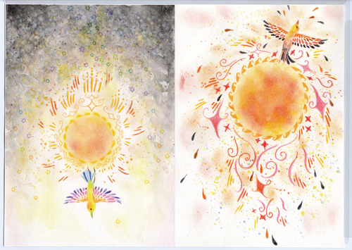 からすは、たいようを つかむとこんどは オキナの おなかのなかから、そらへ とびだしましたはばたく からすのからだを、たいようのほのおはじりじり じりじりとやいていきますからすは あつくて あつくて たまりませんけれど、からすは とびつづけましたみんなが だいすきな たいようをそらへ かえすために