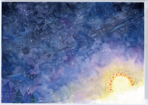 まっくろな からすのほしは、よぞらに まぎれてわたしたちの めにはよく みえないかもしれませんけれども たしかに そらにいて、たいようが、もうだれかに たべられてしまわないように、せかいを しずかに みまもっています