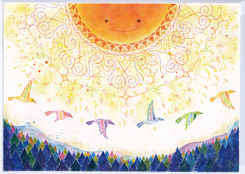 むかし むかしの おおむかしたいようが、きんいろのひかりを きらきら ふらせて、アイヌの せかいを てらしていましたアイヌの せかいに くらす どうぶつたちは みんな、そのあたたかな ひかりが だいすきですからすも まいにち、ふりそそぐ ひかりのなかをカララク カララク と、うたいながらくるくると とびまわっていました
