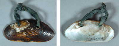 穂摘み具として利用するには、この貝殻のちょうつがいのあたりに2カ所穴を開け、これに紐を通して輪を作ります。この輪に中指と薬指を差し込んで貝殻を握り、貝の口部を穀物の穂に当ててちぎり取り、サラニプ(編み袋)などに入れて収穫しました。なお、この穂摘み具のこともアイヌ語では「ピパ」といいます。