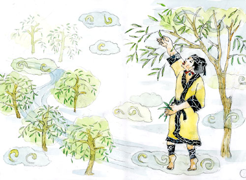 柳(やなぎ)の 木(き)の 葉( は )を かごに ていねいに つみ はじめました。