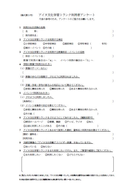 アイヌ文化学習トランクご利用後、アンケートにご記入のうえ、トランクに同梱し、運送期間を含め返却日までに財団へご返却ください。(借用・返却時の送料は申請者の負担とします。)