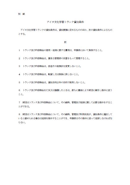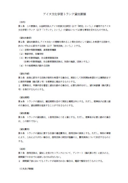 ①アイヌ文化学習トランク貸出要領 ②アイヌ文化学習トランク貸出条件(別紙)