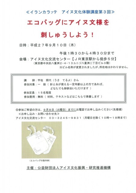 27年度 第3回《イランカラプテ アイヌ文化体験講座のご案内》(平成27年9月10日)