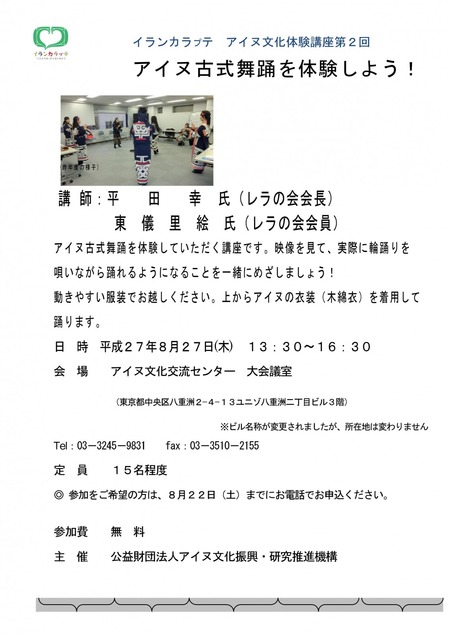 - 27年度 第2回《イランカラプテ アイヌ文化体験講座のご案内》(平成27年8月27日)