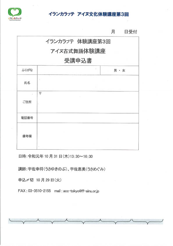令和元年度 第3回《イランカラプテ アイヌ文化体験講座のご案内》(舞踊体験)
